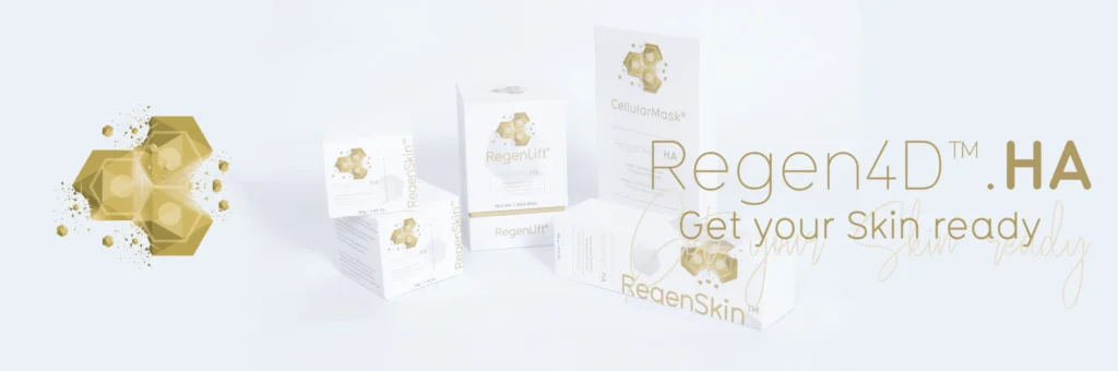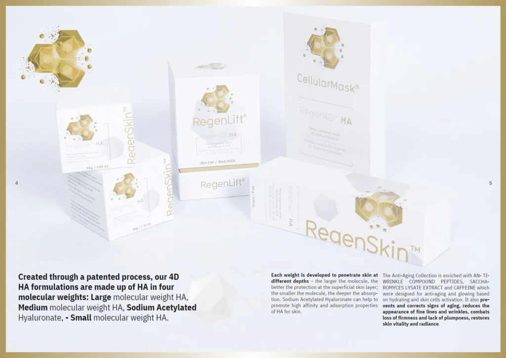 The complete science for pre & post care skin treatment Launched in Late 2022 in the USA, Ireland is one of the first markets in Europe to have access to the RegenSkin range. Created through a patented process, our 4D HA formulations are made up of HA in four molecular weights. Each weight is developed to penetrate skin at different depths – the larger the molecule, the better the protection at the superficial skin layer; the smaller the molecule, the deeper the absorption.